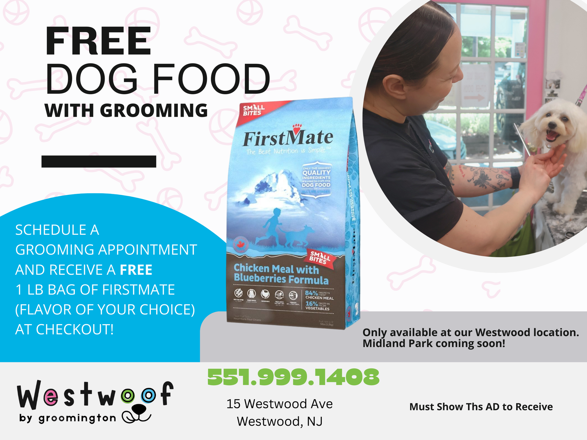 Show us this coupon at your first grooming appointment to recieve a free bag of FirstMate food!